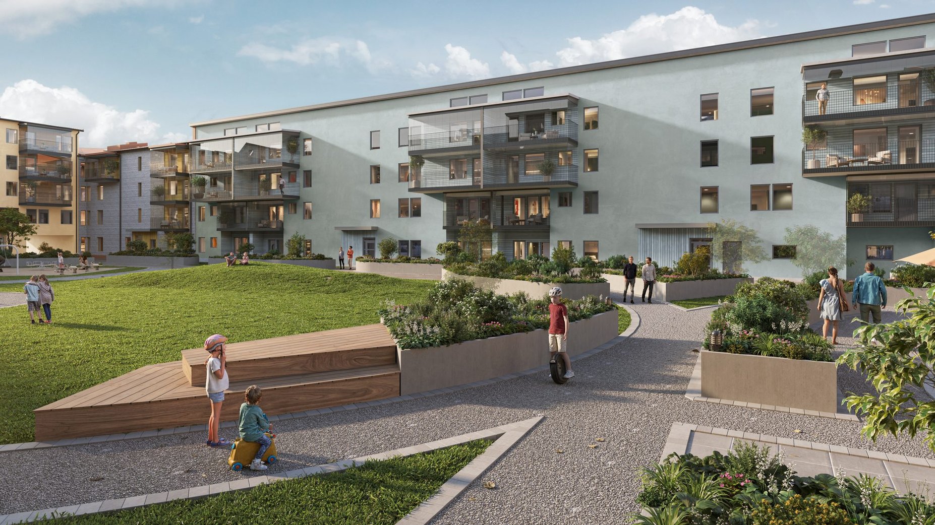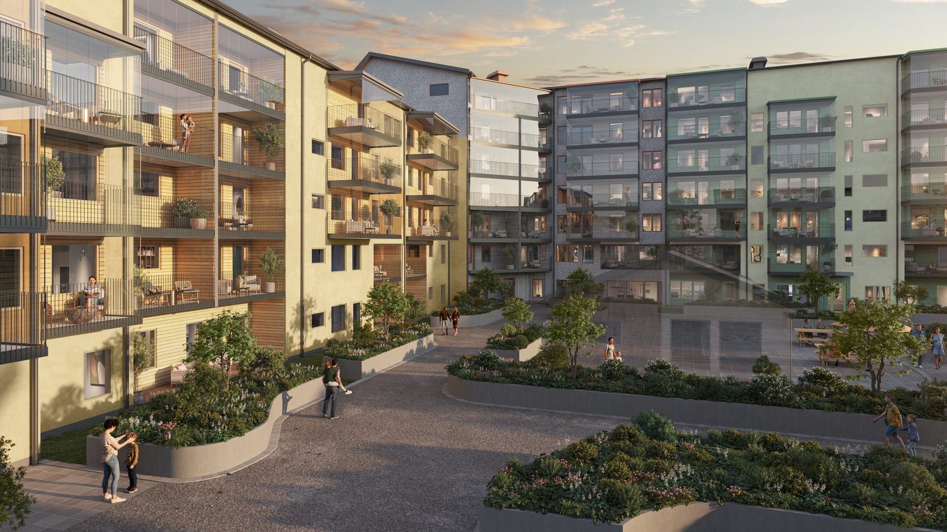 Tänk dig morgonkaffet på din egen uteplats. Grillkvällar på innergården med grannarna. Ett hem där du har plats att andas med högt i tak och genomtänkta lösningar. Det bygger vi här.