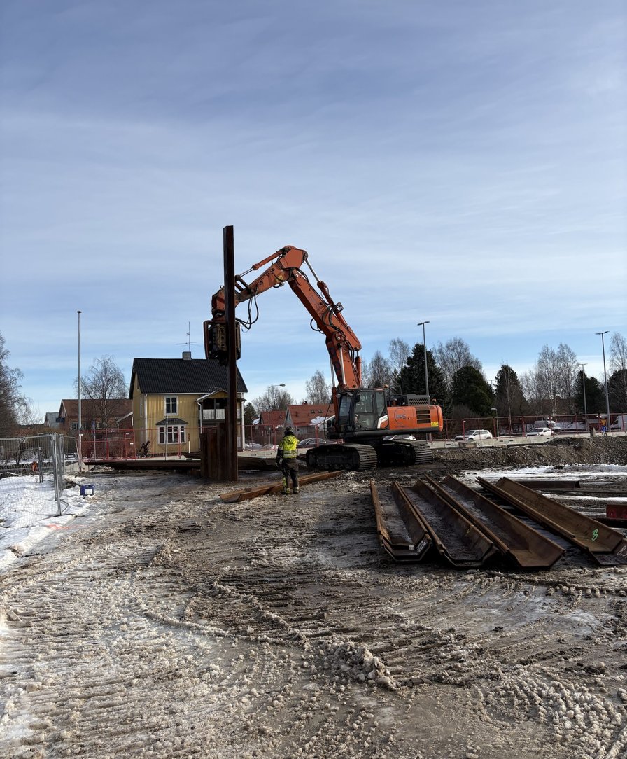 Just nu förbereder vi för grunden genom att schakta och sponta. När vi schaktar gräver vi ner oss i marken och då behöver vi något som håller jorden på plats runt om – det är det sponten gör. Spont är en stålvägg som installeras i schaktkanten och ser till att jorden inte rasar in medan vi arbetar.