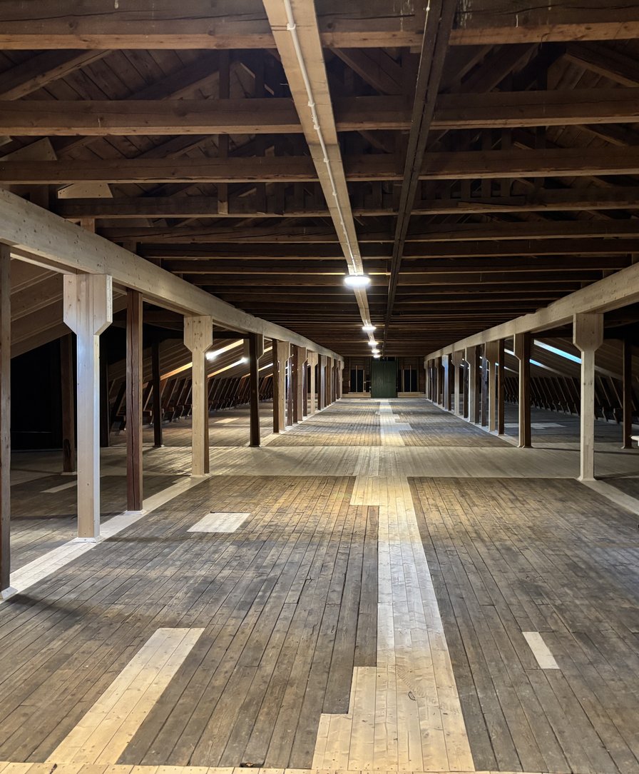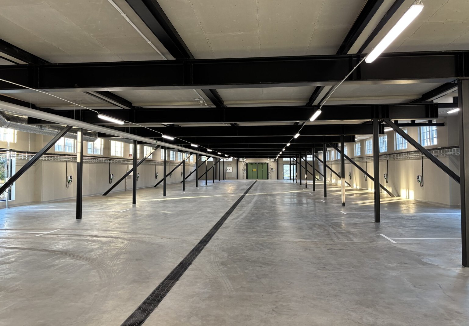 Invändigt har den tidigare stallmiljön förvandlats till en modern parkeringsanläggning med 41 platser för elbilar. Även här har arbetet genomförts med hänsyn till den ursprungliga strukturen. Vind och bjälklag har förstärkts med limträ, vilket stabiliserar stomme och tak utan att ta bort byggnadens historiska känsla.