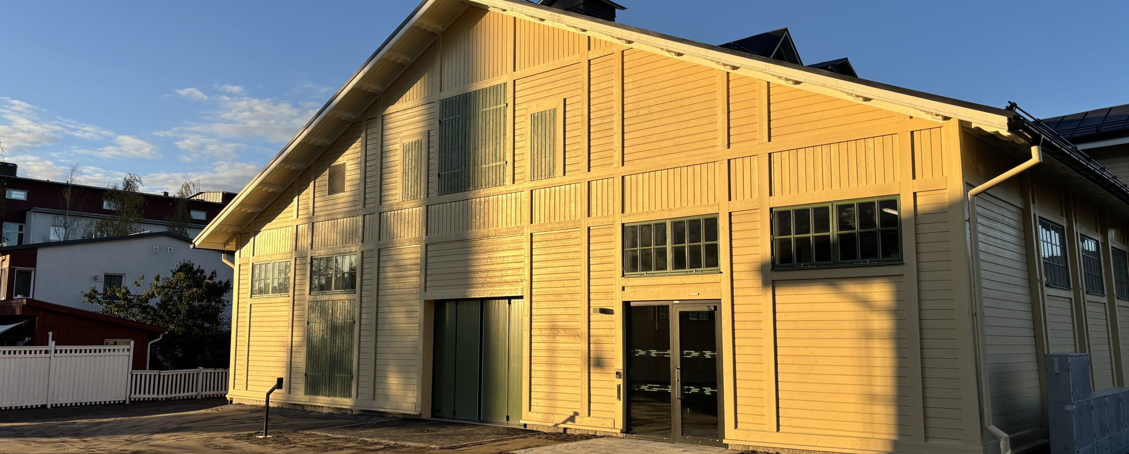 Fasaden har återskapats med panel framtagen med samma fasning som originalet, vilket ger byggnaden tillbaka sin historiska identitet.