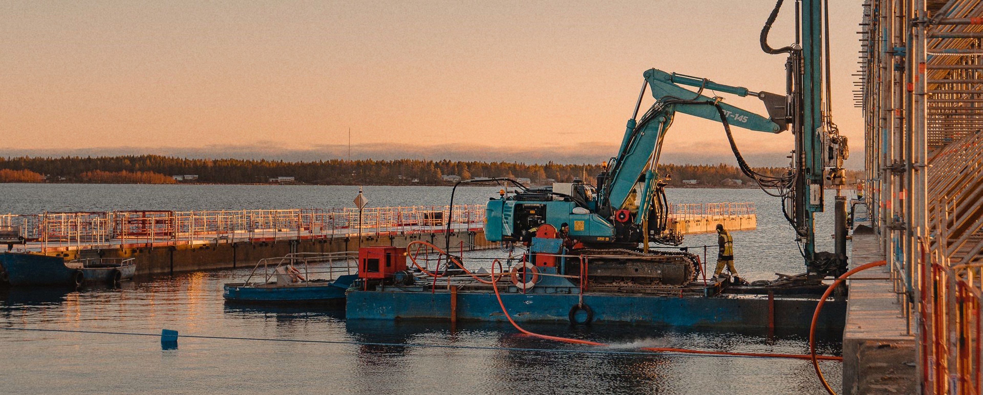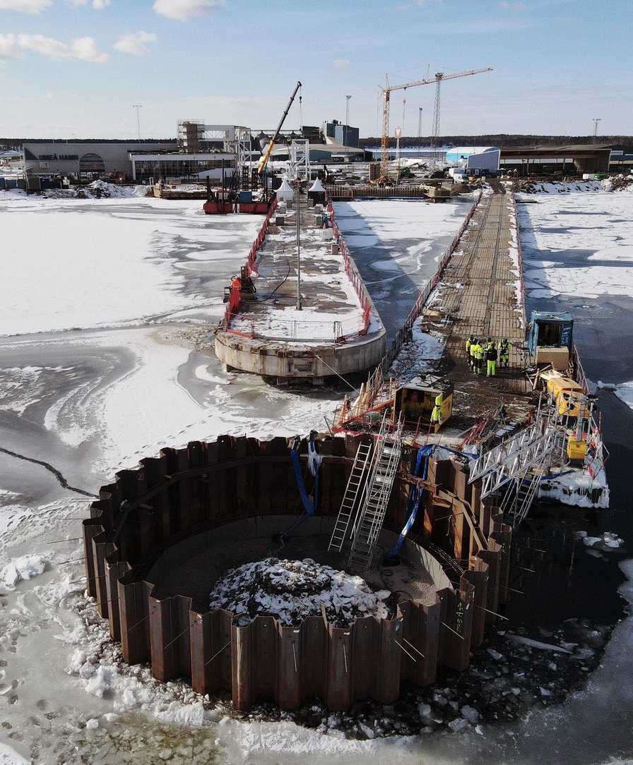 2020 fick Nåiden i uppdrag av Umeå hamn att anlägga en ny kaj från en befintlig kaj i hamnen, samt en ny dykdalb 200 meter ut i vattnet. När projektet startades uppdagades att den befintliga kajen var i sämre skick än först befarat och vi fick kasta om arbetsgång och utförande. För att hinna utföra projektet inom tidsramen – och behålla en god arbetsmiljö – krävdes ett nära och öppet samarbete med Umeå hamn. Utöver det som kontrakterats hann Nåiden projektera om hela dykdalben och arbetsgången av spontkajerna, förstärka den befintliga piren för att släppa fram sidoentreprenader och förstärka landfästen mellan kajerna – allt inom den ursprungliga tidsramen.